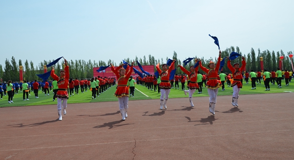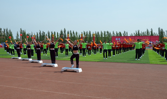 正中间的足球彰显了内蒙古师范大学对足球运动的重视,师大始终贯彻我国“把足球改革发展作为建设体育强国的重要举措”的指导思想。前面后面是手拿安代的100名同学,安代是蒙古族喜闻乐见的艺术表现形式,是大型活动人们庆祝的表现。作为少数民族地区我们始终是秉承着56个民族是一家的思想,所以手持彩绸庆祝本次大赛的顺利举行。外围是手持花球的100人,他们为参加本次比赛的运动员加油助威,希望来自各地区的比赛队伍都能取得优异的成绩,让各代表队都能感受到我们的热情,感受师大的魅力。主席台前方在跑道上表演的是在刚刚结束的全国健美操联赛中取得前三名的内蒙古师范大学健美操队,也是体育学院Super Team炫舞拉拉队的成员。丰富的表演内容,整齐划一的动作,处处彰显着我院学子良好的精神风貌。