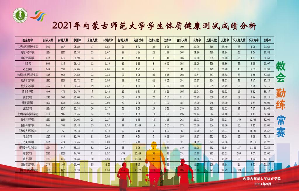为贯彻落实习近平总书记在全国教育大会、全国卫生与健康大会上的重要讲话精神和《中国教育现代化2035》《“健康中国2030”规划纲要》《全民健身条例》《国务院办公厅关于强化学校体育促进学生身心健康全面发展的意见》等相关要求,根据学校整体安排部署,体育学院于2020年10月—2021年4月对我校2017级、2018级、2019级、2020级22个学院的22674名本科生进行年度体质健康测试工作。