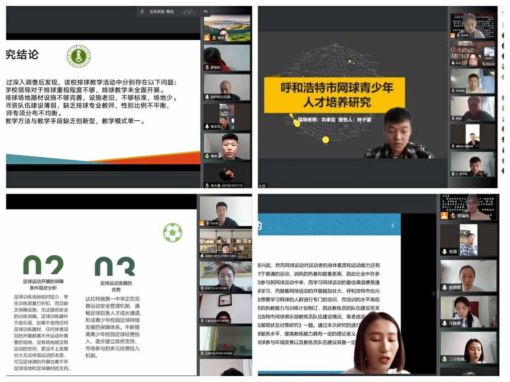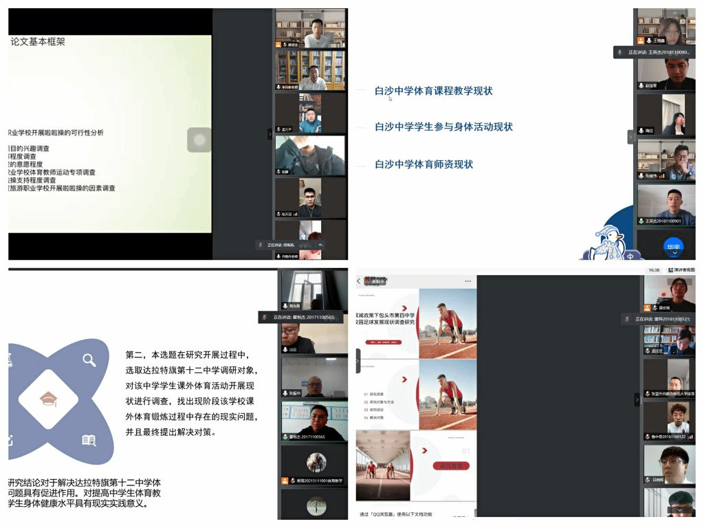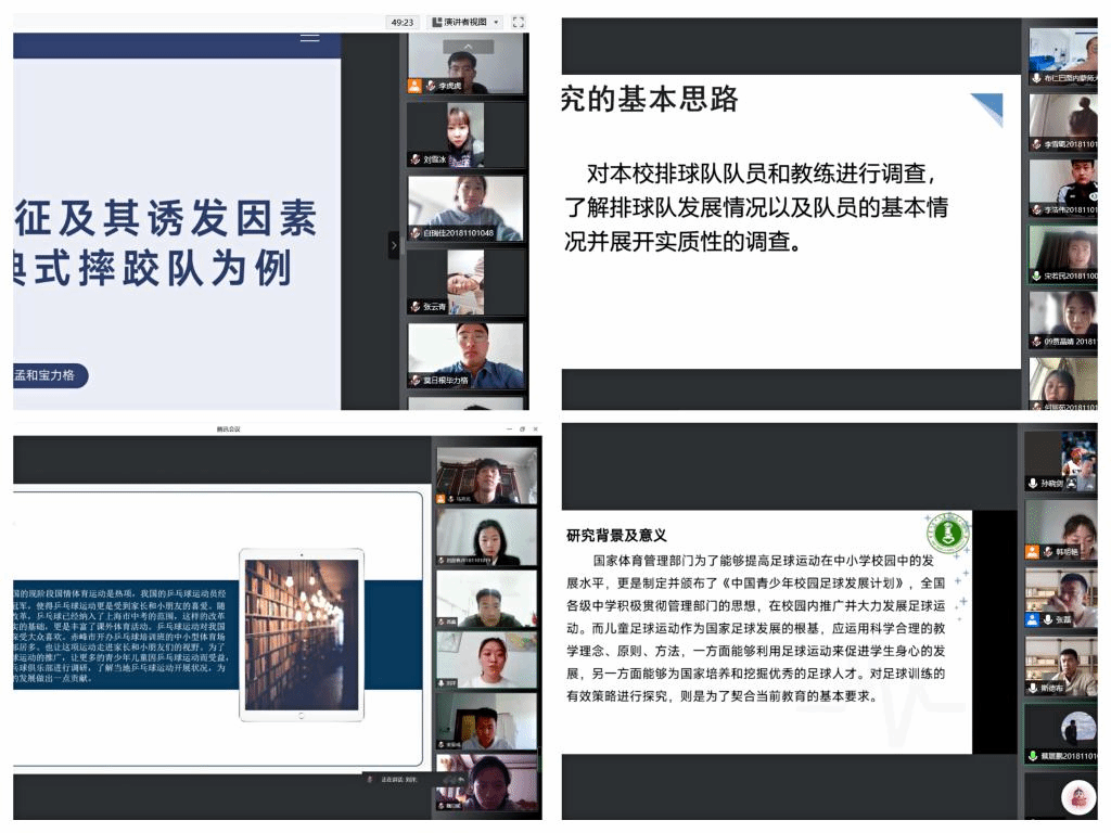 在疫情防控期间,做到战“疫”防控不放松、学位授予不延迟。学院在李凤新副院长的领导下制定了一系列方案措施,精心设计各项环节。从论文选题、开题报告到论文修改、定稿、查重等环节实现全过程平台操作。指导老师严格按照毕业论文工作计划,通过超星论文平台对学生论文进行精心指导,确保每位学生论文撰写工作顺利进行。在答辩过程中,各位答辩老师严把质量关,为提高体育学院本科教学质量及一流专业建设、评估工作奠定基础。此次答辩过程全程录屏和截图,以便存档、备查。